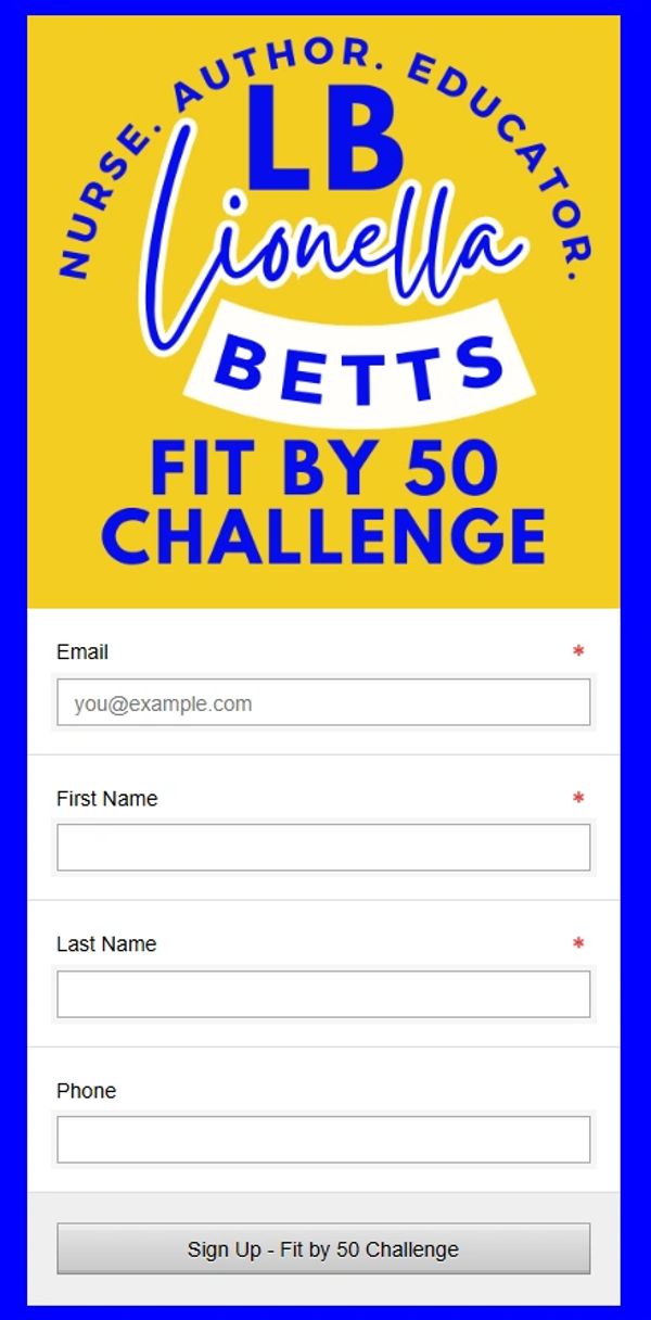 Share your journey with us via Email at Info@LionellaBlake.com or on social media using #FitBy50Challenge.